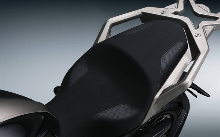 Η ρυθμιζόμενη ζελατίνα προστατεύει τον αναβάτη από τον αέρα, ενώ πίσω της υπάρχει η μεγάλη ψηφιακή οθόνη-πολυόργανο και το ψηλό τιμόνι με προστατευτικές χούφτες, με αντίβαρα στα άκρα του και ρυθμιζόμενες μανέτες. Πίσω από το τιμόνι, βρίσκεται ένα χρηστικό ντουλαπάκι που ανοίγει με push button για ψιλά ή το “κλειδί”-πομπό. Στο εσωτερικό της μάσκας υπάρχει μία κρυφή θύρα φόρτισης USB.