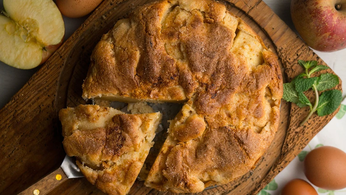 Ρίξτε το μισό μείγμα στο ταψί, στρώστε τα μήλα και καλύψτε με το υπόλοιπο μείγμα.