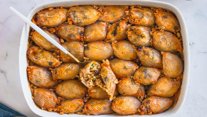 Αφαιρούμε τα φύλλα από τα μεγάλα κρεμμύδια, γεμίζουμε με 1 κ.σ. γέμιση και τα τυλίγουμε σφιχτά. Αραδιάζουμε στο ταψί με την ένωση προς τα κάτω.