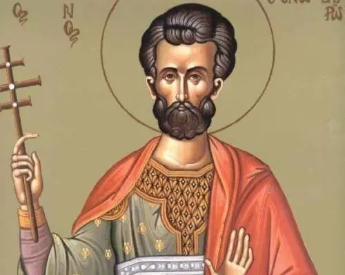 Τον Ήλιον της δόξης Σταυρώ προσηλωθέντα, και τοις εν σκιά του θανάτου εκλάμποντα ως είδες, ηυνάσθης αυτού ταίς αστραπαίς, και ήθλησας Λογγίνε ευσεβώς, διά τούτο νοσημάτων παντοδαπών, λυτρούσαι τους εκβοώντας, δόξα τω δεδωκότι σοι ισχύν, δόξα τω σε στεφανώσαντι, δόξα τω ενεργούντι διά σου, πάσιν ιάματα