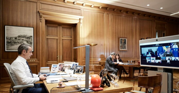 Ο Κυριάκος Μητσοτάκης κατά την διάρκεια της τηλεδιάσκεψης