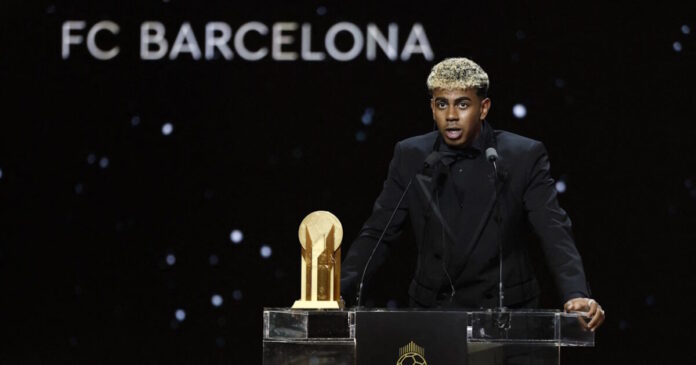 Ο Λαμίν Γιαμάλ κέρδισε τους Ντουέ, Εστεβάο, Μέντες και Γιλντίζ και πήρε στα χέρια του το βραβείο του καλύτερου νεαρού παίκτη για την ποδοσφαιρική χρονιά 2024-2025, κατά τη διάρκεια του gala της Χρυσής Μπάλας.