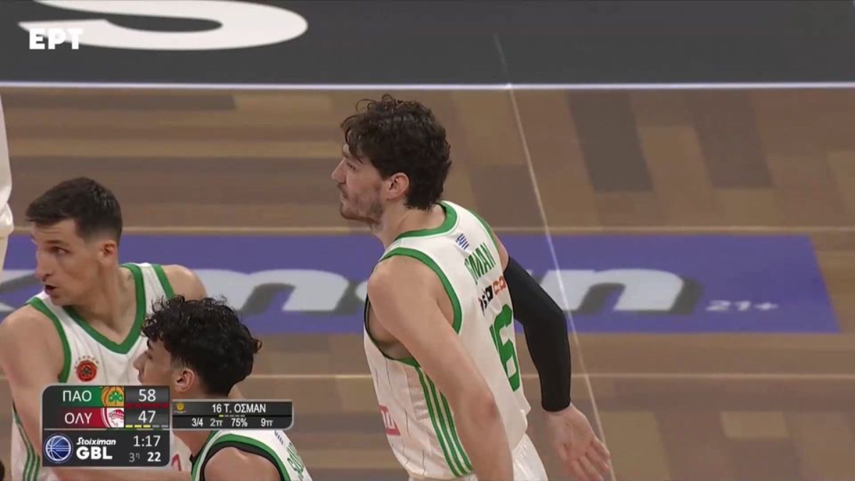 Ο Όσμαν έδωσε ένα απίστευτο highlight στο ντέρμπι “αιωνίων”. Ο Τούρκος διεκδίκησε ένα ριμπάουντ απέναντι στον Μουστάφα Φαλ, με την μπάλα να καταλήγει στην πλάγια γραμμή. Εκεί ο παίκτης του Παναθηναϊκού βούτηξε για να την σώσει, κάνοντας όλο το γήπεδο να παραληρεί και στην συνέχεια δέχτηκε την μπάλα στην βασική γραμμή, όπου νίκησε τον Πίτερς και σκόραρε για να σηκώσει όλο το ΟΑΚΑ στο πόδι.