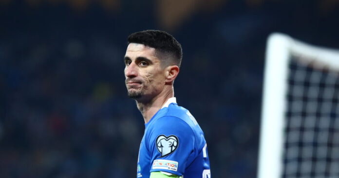 Ο Πέτρος Μάνταλος με το περιβραχιόνιο του αρχηγού της Εθνικής Ελλάδας (ΜΑΡΚΟΣ ΧΟΥΖΟΥΡΗΣ / EUROKINISSI)