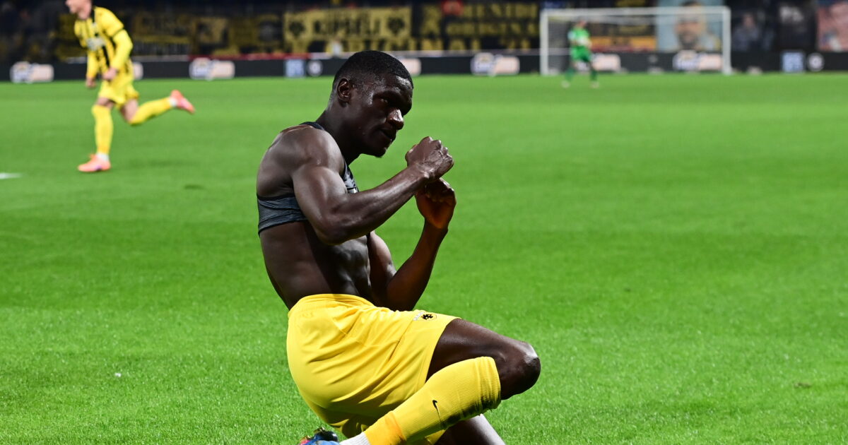 Ο Ζίνι πανηγυρίζει κόντρα στον Άρη (ΓΙΩΡΓΟΣ ΜΑΤΘΑΙΟΣ / EUROKINISSI)