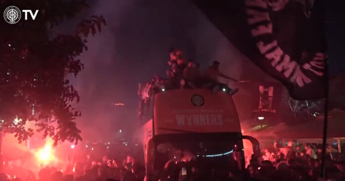 Ο Μιχάλης Μπούσης ήταν όρθιος στην οροφή που πούλμαν και πανηγύριζε εκστασιασμένος με την κούπα στα χέρια, ενώ ο αρχηγός της ομάδας, Βασίλης Λαμπρόπουλος έκλεψε την παράσταση, φορώντας τους πανηγυρισμούς μία μάσκα του… Captain America. Στο επίκεντρο και οι Νέιρα – Φούντας, που έγιναν σύνθημα στα χείλη των οπαδών τη ομάδας.