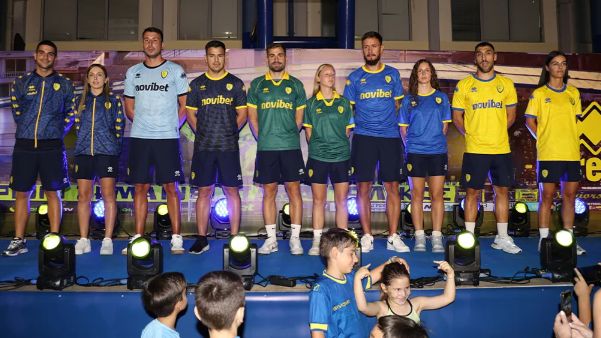 Οι αρχηγοί της ομάδας Γιώργος Λιάβας, Σεμπάστιαν Μλάντεν, Χάρης Μαυρίας, που συνοδεύονταν από τα κορίτσια της ομάδας γυναικών Σίσυ Ασημάκη, Ολυμπία Σιορίκη, Εύη Παπαϊωάννου, φόρεσαν τις τρεις εμφανίσεις, κίτρινη, μπλε, πράσινη. Οι τερματοφύλακες Λούκας Τσάβες – Ζίβκο Ζίβκοβιτς παρουσίασαν τις φανέλες τους, ενώ ο Χρήστος Μπελεβώνης και η Στέλα Ντζάνη τα τζάκετ παράταξης.