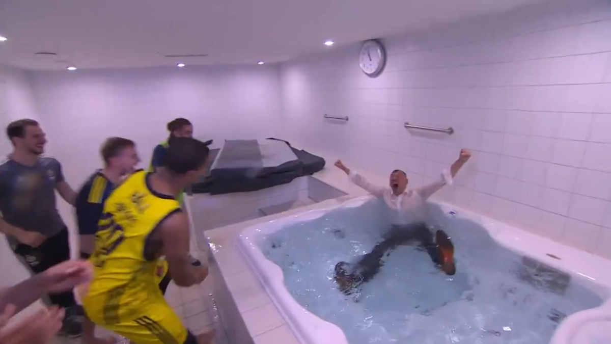 Στα αποδυτήρια οι πανηγυρισμοί ήταν έντονοι με τον Γιασικεβίτσιους να μην γλιτώνει το καθιερωμένο μπουγέλο, ωστόσο οι παίκτες της Φενέρ το πήγαν ένα βήμα παραπέρα πετώντας στο τζακούζι τον Λιθουανό τεχνικό.//ΝΚ.