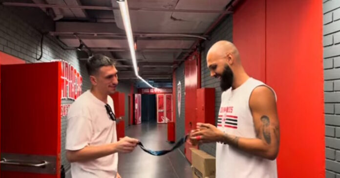Ο Γιαννούλης Λαρεντζάκης ήταν πάντως αυτός που έκλεψε την παράσταση στα αποδυτήρια του ΣΕΦ, δείχνοντας με υπερηφάνεια το μετάλλιο που κατέκτησε με την Εθνική Ελλάδας στο Eurobasket.