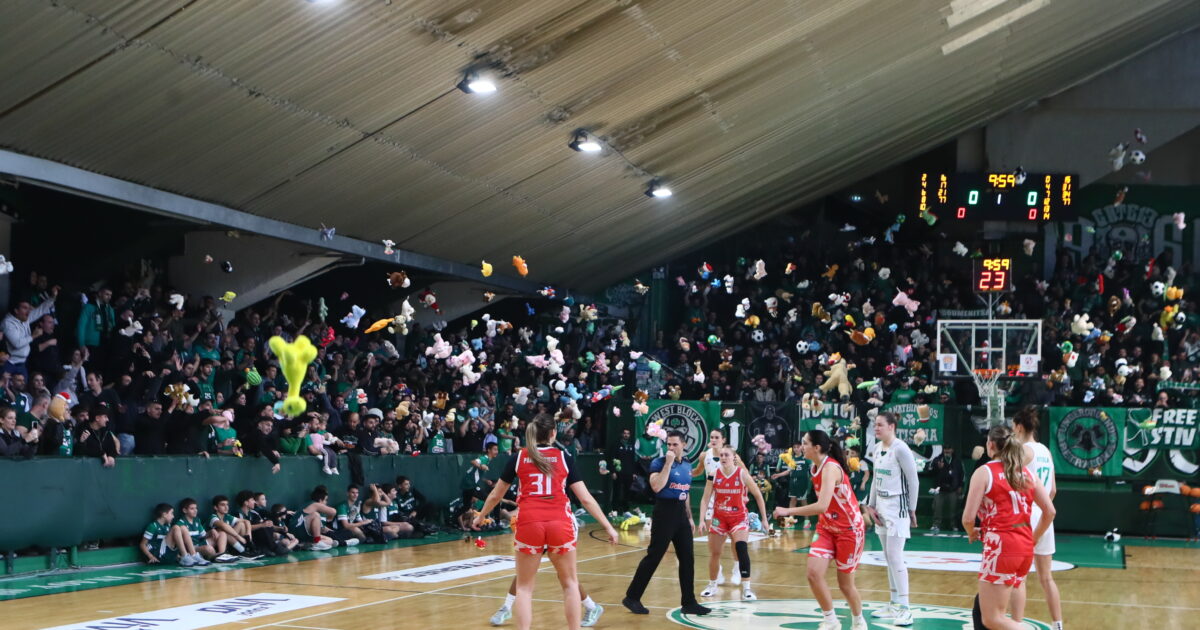 Λίγο πριν γίνει το τζάμπολ της αναμέτρησης ανάμεσα στον Παναθηναϊκό και τον Πανσερραϊκό για την Α1 μπάσκετ γυναικών οι φίλοι του «τριφυλλιού» γέμισαν με λούτρινα κουκλάκια το παρκέ του κλειστού της Λεωφόρου.