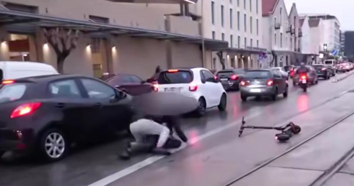 Όπως καταγράφηκε σε ζωντανή σύνδεση, η ρόδα του πατινιού σφήνωσε στις γραμμές του τρένου, με αποτέλεσμα να χάσουν τον έλεγχο και να πέσουν στο οδόστρωμα.