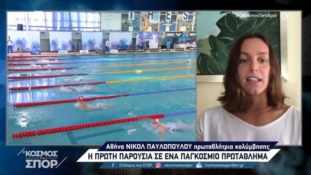 Η πρωταθλήτρια της κολύμβησης, Νικόλ Παυλοπούλου, εμφανίστηκε στην εκπομπή της ΕΡΤ 3 “Ο Κόσμος των Σπορ”, όπου εξέφρασε την ικανοποίησή της για την πολύ θετική επιστροφή που πραγματοποίησε και γηια την πρόκρισή της στο Παγκόσμιο Πρωτάθλημα της Σιγκαπούρης.