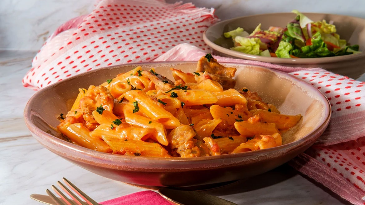 Ενώ η σάλτσα σιγοβράζει, βράστε τις πένες σε αλατισμένο νερό σύμφωνα με τις οδηγίες της συσκευασίας μέχρι να γίνουν al dente. Κρατήστε ένα φλιτζάνι νερό από τα ζυμαρικά πριν τα σουρώσετε.
