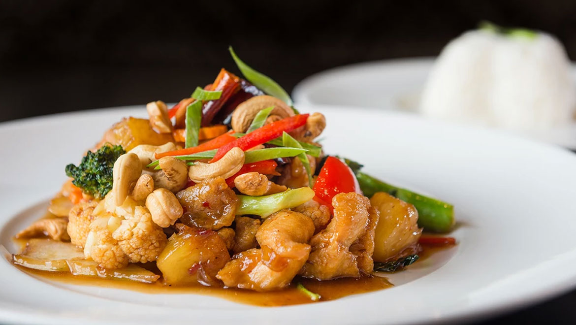 Τοποθετήστε ένα τηγάνι σε μέτρια προς δυνατή φωτιά και προσθέστε το ελαιόλαδο. Προσθέστε τις φέτες κόκκινου τσίλι και το τζίντζερ στο καυτό λάδι. Μαγειρέψτε, ανακατεύοντας συχνά, μέχρι να αρωματιστεί το λάδι, περίπου 2 λεπτά. Ανακατέψτε τα κάσιους και το σκόρδο -μαγειρέψτε μέχρι τα κάσιους να ροδίσουν ελαφρώς, περίπου 2 λεπτά ακόμα.