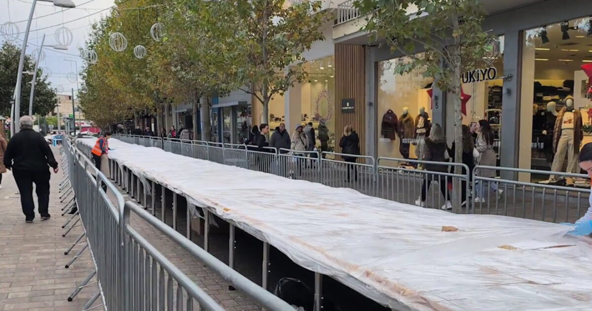 Όσο για το τεχνικό κομμάτι της ένωσης των κομματιών, εξήγησε: «Έχουν ενωθεί οι πίτες, ναι με λαμαρίνες έχουν ενωθεί, γιατί δεν μπορεί να γίνει αυτό σε μία πλευρά. Έχουν πασπαλιστεί, έχουν μπει οι κανέλες, όλα τα αρωματικά τους και είναι έτοιμο το απόγευμα να γίνει η κοπή και να μοιραστεί στον κόσμο».