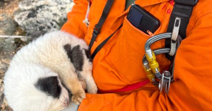Το κουταβάκι που επέζησε βρίσκεται στα χέρια του διασώστη της ομάδας «Χείρων» / πηγή φωτογραφίας Facebook