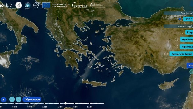 Καίριος επίσης είναι ο ρόλος των δορυφορικών παρατηρήσεων, των τεχνικών ανάλυσης εικόνας και των σύγχρονων μεθόδων παρακολούθησης στην έγκαιρη ανίχνευση, τη χαρτογράφηση της εξάπλωσης και την αποτίμηση των επιπτώσεων των πυρκαγιών στο φυσικό και ανθρωπογενές περιβάλλον. Για παράδειγμα στην πυρκαγιά στη Χίο στις 23 Ιουνίου 2025 όπως απεικονίζεται μέσω δορυφόρου εκτεταμένο πλούμιο (σχηματισμός, στήλη) καπνού που εκκινεί από το νησί και μεταφέρεται νοτιοδυτικά, καλύπτει μεγάλο τμήμα του Αιγαίου μέχρι και την Κρήτη (κεντρική φωτογραφία). Η συγκεκριμένη εικόνα, όπως τονίζει η επιστημονική ομάδα, αποτυπώνει με εντυπωσιακή σαφήνεια τη χωρική διάσταση του φαινομένου, αναδεικνύοντας τον ρόλο των ατμοσφαιρικών συνθηκών -και συγκεκριμένα των ισχυρών βόρειων ανέμων- στην ταχεία μεταφορά καπνού και αιωρούμενων σωματιδίων σε εκατοντάδες χιλιόμετρα μακριά από την πηγή τους.