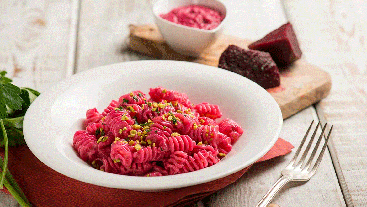 Ρίξτε τη σάλτσα παντζαριού πάνω από τα μαγειρεμένα ζυμαρικά και ανακατέψτε για να καλυφθούν καλά.