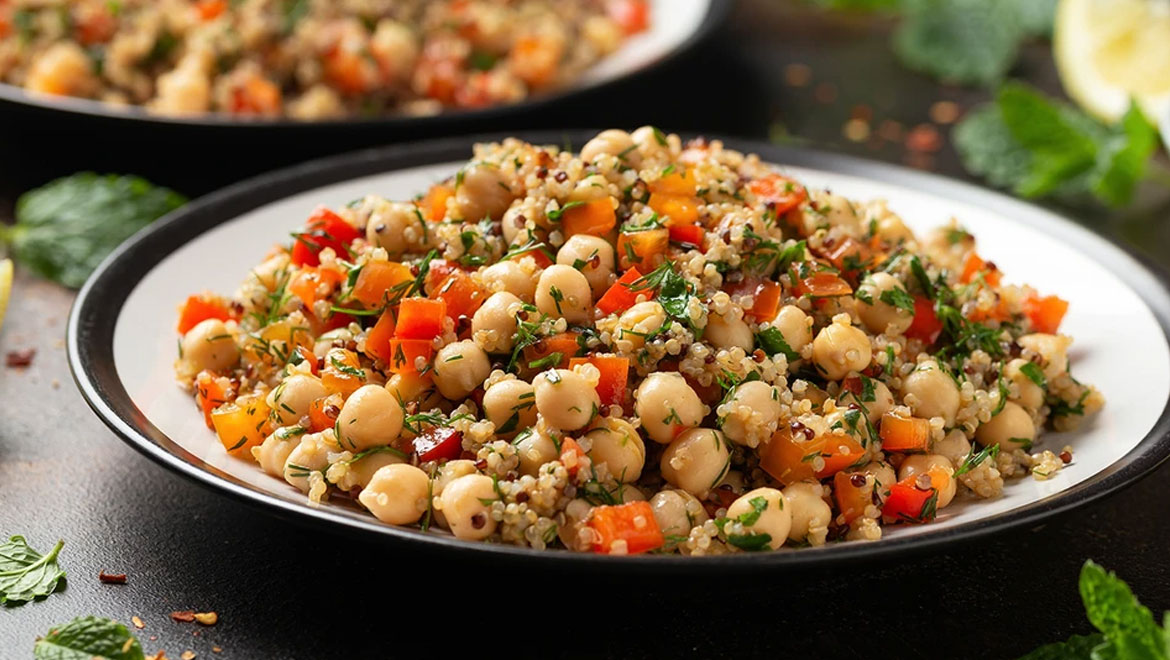 Σε ένα μεγάλο μπολ, ανακατέψτε την κινόα με τα ρεβίθια, τη ντομάτα και το αγγούρι.
