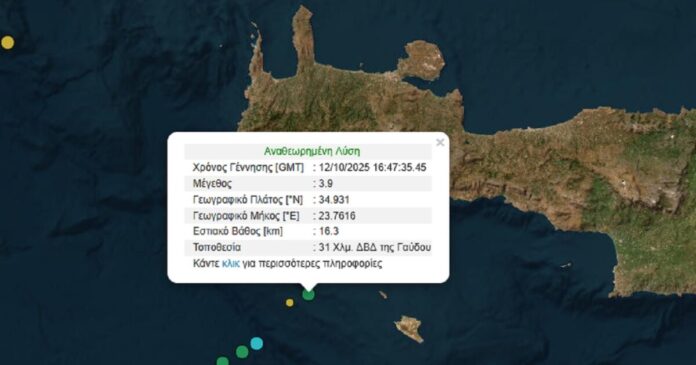 Αρχική ΕΙΔΗΣΕΙΣ Σεισμός 3,9 Ρίχτερ νότια της Κρήτης και κοντά στη Γαύδο ΕΙΔΗΣΕΙΣ Σεισμός 3,9 Ρίχτερ νότια της Κρήτης και κοντά στη Γαύδο Από Newsroom - 12 Οκτωβρίου 2025 Κοινοποίηση FacebookTwitterPinterestLinkedin Σεισμός 3,9 Ρίχτερ σημειώθηκε το απόγευμα της Κυριακής 12 Οκτωβρίου νότια της Κρήτης και κοντά στη Γαύδο. Ο σεισμός στα νότια της Κρήτης είχε εστιακό βάθος 16,3 χιλιόμετρα και σημειώθηκε 31 χλμ νότια νοτιοδυτικά από την Γαύδο. Περισσότερα σχόλια Πηγή ΠΑΡΟΜΟΙΑ ΑΡΘΡΑΠΕΡΙΣΣΟΤΕΡΑ ΑΠΟ ΤΟΝ ΔΗΜΙΟΥΡΓΟ Αγρότες και κτηνοτρόφοι έστησαν μπλόκα κλείνοντας την Πατρών – Κορίνθου, αποκλεισμένα τα τελωνεία Προμαχώνα, Ευζώνων και Εξοχής Oikogeneia.gov.gr: Μια ενιαία ψηφιακή πύλη για την οικογένεια Το πιο χριστουγεννιάτικο τραμ είναι γεγονός και βρίσκεται στην Αθήνα – Στολισμένο με λαμπάκια και γιρλάντες εκτελεί τα δρομολόγιά του H Κίμπερλι Γκιλφόιλ στη Μητρόπολη Θεσσαλονίκης και τον Άγιο Δημήτριο – «Γεια σου Βόρεια Ελλάδα» Κλειστοί οι σταθμοί του μετρό «Πανεπιστήμιο» και «Σύνταγμα» αύριο Σάββατο για πολλές ώρες λόγω των πορειών για τον Αλέξη Γρηγορόπουλο Κακοκαιρία Byron: Σοκαριστικές εικόνες καταστροφής σε νεκροταφείο στην Εύβοια Ροή ειδήσεων Μουντιάλ 2026: Αυτοί είναι οι 12 όμιλοι της διοργάνωσης 5 Δεκεμβρίου 2025 Αγρότες και κτηνοτρόφοι έστησαν μπλόκα κλείνοντας την Πατρών – Κορίνθου, αποκλεισμένα... 5 Δεκεμβρίου 2025 ΠΑΟΚ – Ολυμπιακός: Η απονομή του τροπαίου του League Cup του... 5 Δεκεμβρίου 2025 Ο Ντόναλντ Τραμπ πήρε το βραβείο ειρήνης της FIFA στην κλήρωση... 5 Δεκεμβρίου 2025 Τιμοτέ Σαλαμέ: Το σημαντικότερο μήνυμα ήταν από τον Ντι Κάπριο 5 Δεκεμβρίου 2025 Oikogeneia.gov.gr: Μια ενιαία ψηφιακή πύλη για την οικογένεια 5 Δεκεμβρίου 2025 ΚΑΕ Ολυμπιακός: «Αδιαπραγμάτευτη προτεραιότητα η δημόσια ασφάλεια και όχι οι φαντασιώσεις... 5 Δεκεμβρίου 2025 Το πιο χριστουγεννιάτικο τραμ είναι γεγονός και βρίσκεται στην Αθήνα –... 5 Δεκεμβρίου 2025 H Κίμπερλι Γκιλφόιλ στη Μητρόπολη Θεσσαλονίκης και τον Άγιο Δημήτριο –... 5 Δεκεμβρίου 2025 Μουντιάλ 2026: Live Streaming η κλήρωση για τους ομίλους της τελικής... 5 Δεκεμβρίου 2025 Φόρτωση περισσοτέρων