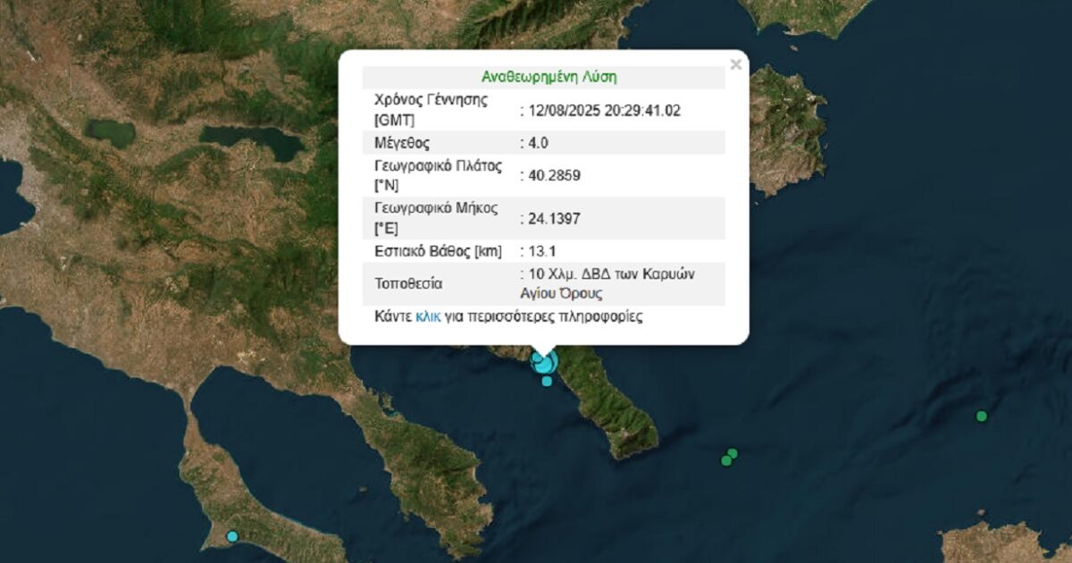 Σεισμός μεγέθους 4 Ρίχτερ εκδηλώθηκε στο Άγιο Όρος το βράδυ της Τρίτης 12 Αυγούστου λίγο μετά τις 23.30.