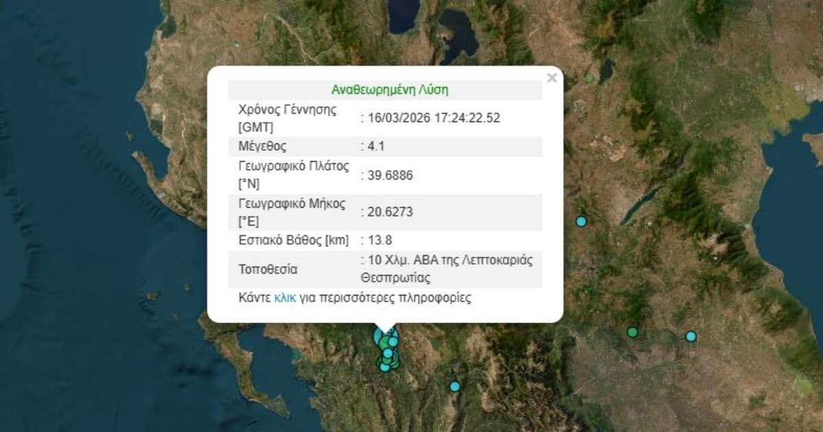Σεισμός ταρακούνησε την Θεσπρωτία το βράδυ της Δευτέρας 16.03.2026, με μέγεθος 4,1 βαθμούς της κλίμακας Ρίχτερ.