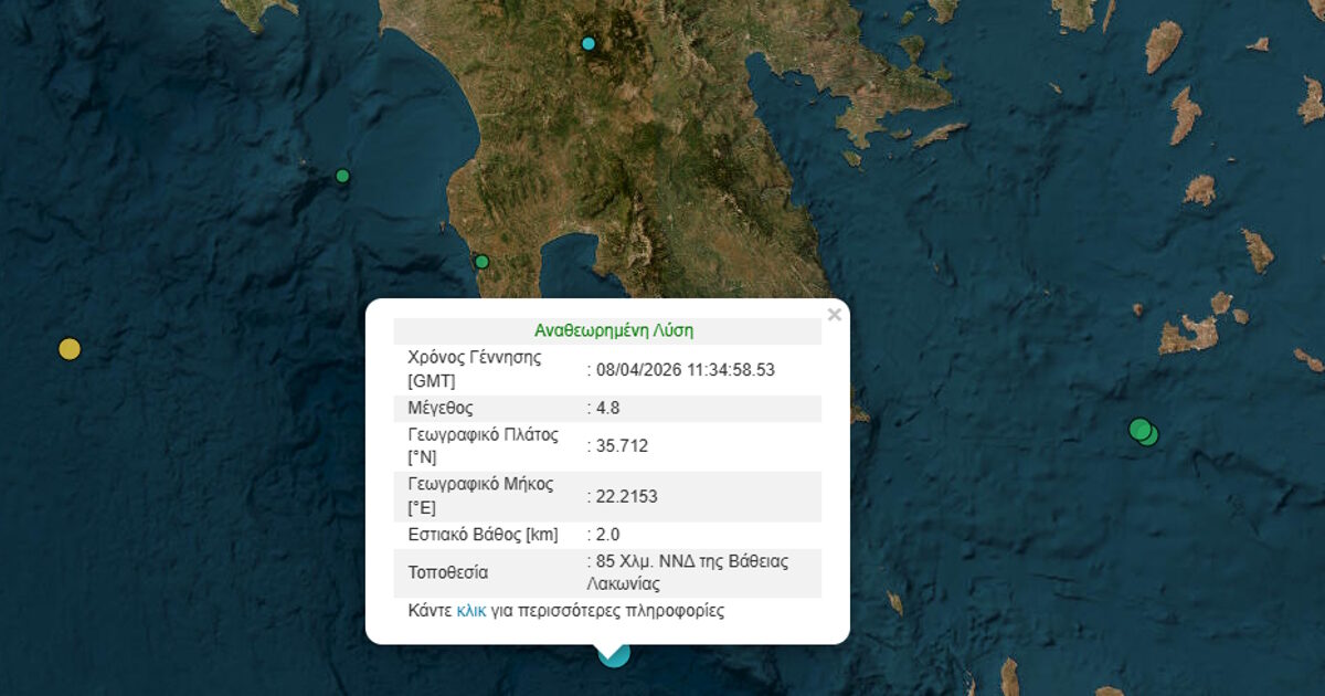 Σεισμός μεγέθους 4,8 Ρίχτερ σημειώθηκε στη Λακωνία σήμερα (8/4/2026), Μεγάλη Τετάρτη το μεσημέρι.