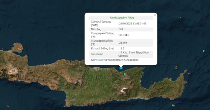 Σεισμός μεγέθους 3,8 Ρίχτερ σημειώθηκε το απόγευμα της Τρίτης (21.10.2025) στο Λασίθι, στην Κρήτη.