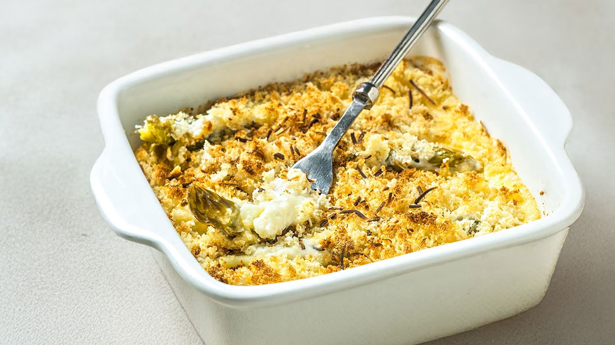Τοποθέτησε τα σπαράγγια σε ένα βουτυρωμένο πυρίμαχο σκεύος, ρίξε από πάνω τη μπεσαμέλ και, αν θέλεις, πρόσθεσε λίγη τριμμένη φρυγανιά για τραγανή υφή.