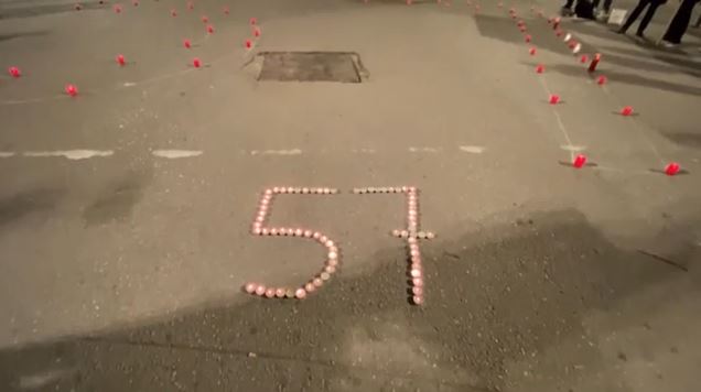 Δεκάδες πολίτες άφησαν αναμμένα κεριά στο έδαφος, σχηματίζοντας τον αριθμό 57, όσα και τα θύματα της σιδηροδρομικής τραγωδίας.