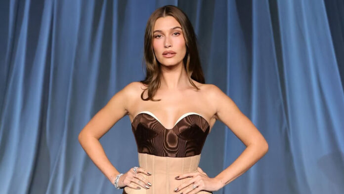 Η Hailey Bieber επέλεξε ένα look απευθείας από το ss show υψηλής ραπτικής του οίκου Schiaparelli για το 2026. Το φόρεμά της αγκάλιαζε τη σιλουέτα της, χάρη στον κορσέ που είχε, δημιουργώντας την οπτική ψευδαίσθηση ότι το υπόλοιπο φόρεμα, σε απόχρωση εσπρέσο, ήταν στην πραγματικότητα ένας συνδυασμός φούστας και strapless bustier.