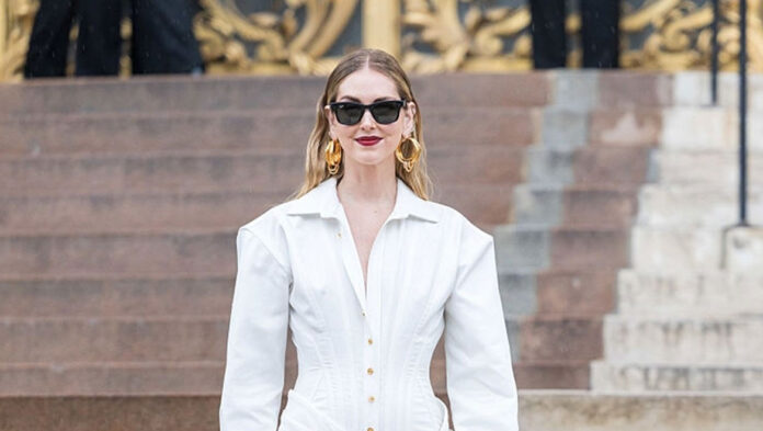 Για την περίσταση, η Ιταλίδα επιχειρηματίας και mega influencer επέλεξε να φορέσει ένα σούπερ μίνι shirt dress από τη ready-to-wear συλλογή του ίδιου οίκου, το οποίο συνδύασε με χρυσά πέδιλα Gucci, χρυσά κοσμήματα και το τσαντάκι Mini Anatomy Jewelery Bag με την υπογραφή Schiaparelli.