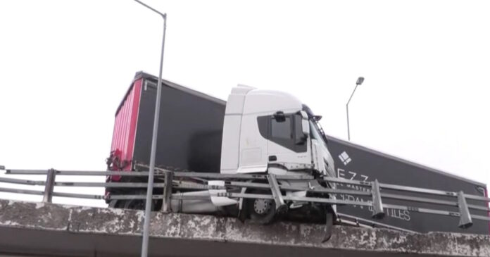 Άγιο είχε ένας οδηγός νταλίκας που έχασε τον έλεγχο του οχήματος στη Θεσσαλονίκη και κατέληξε στα κιγκλιδώματα γέφυρας, ενώ το μπροστινό τμήμα του φορτηγού βρέθηκε στον αέρα.
