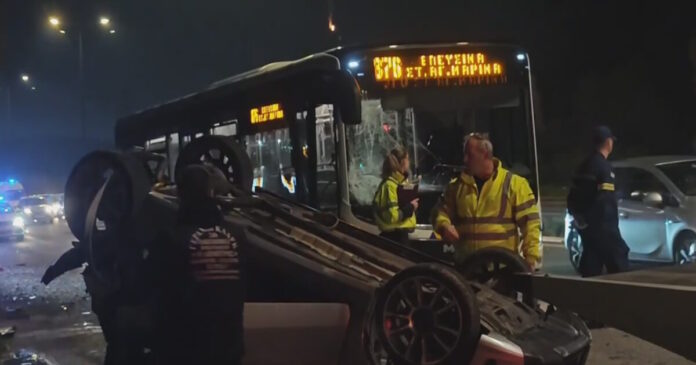 Από το τροχαίο στο ύψος του Σκαραμαγκά το ΙΧ ανατράπηκε, καθώς η σύγκρουση με το λεωφορείο που κινούνταν στο ρεύμα προς Αθήνα, ήταν ιδιαίτερα σφοδρή.