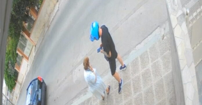 Στο βίντεο διακρίνεται ένα μέλος του κυκλώματος να συναντά μια ηλικιωμένη έξω από μια πολυκατοικία και να συνομιλούν.