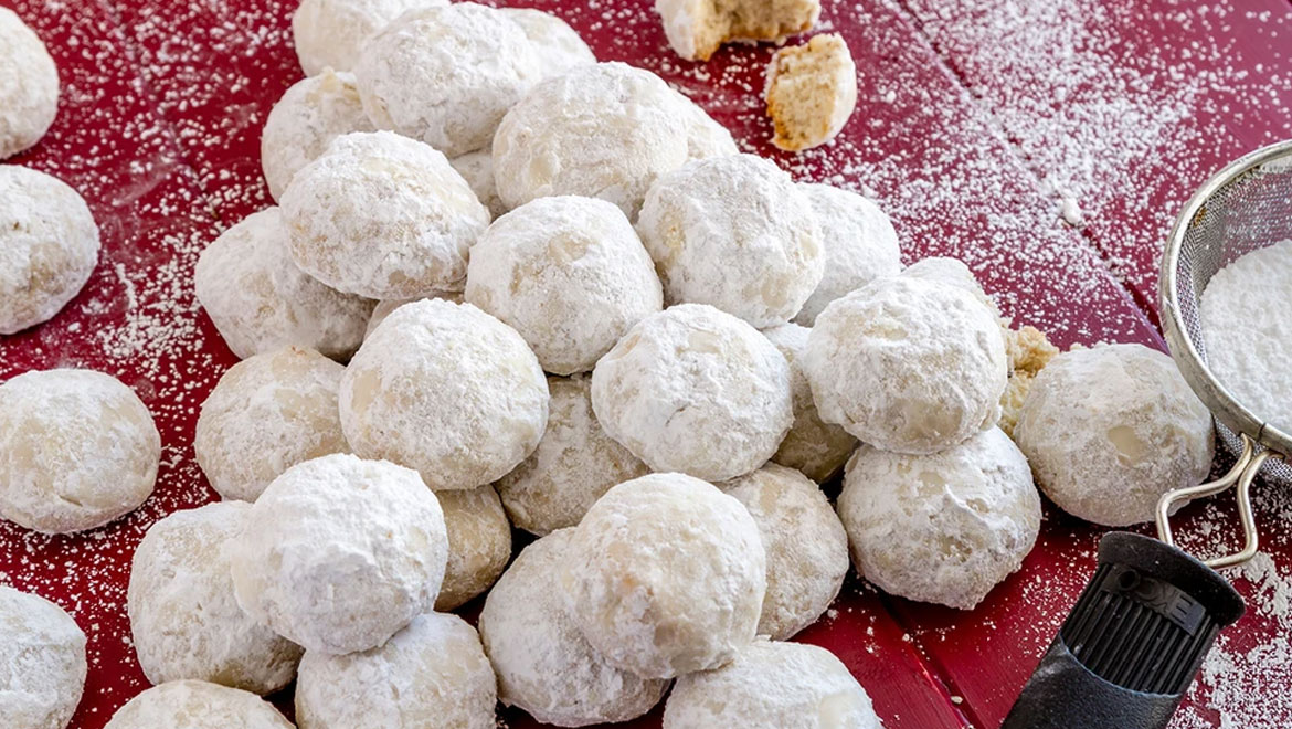Πλάστε τους κουραμπιέδες σε μικρές μπαλίτσες και τοποθετήστε τους σε ταψί με λαδόκολλα.